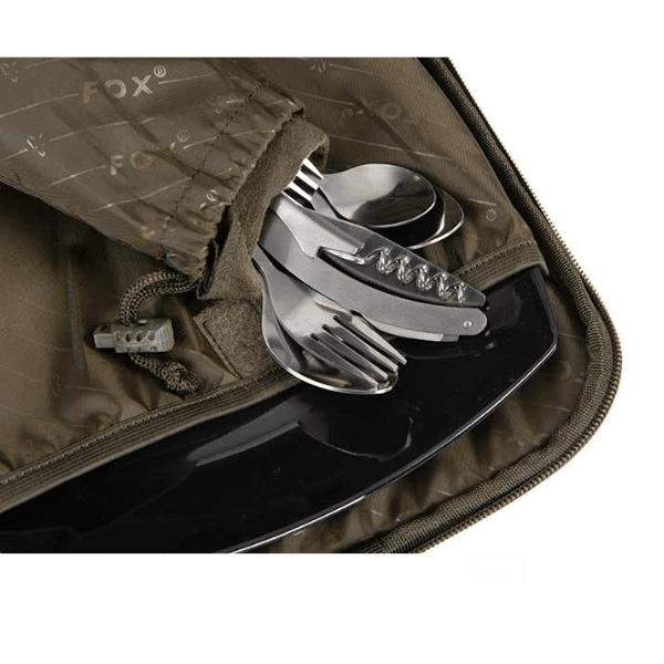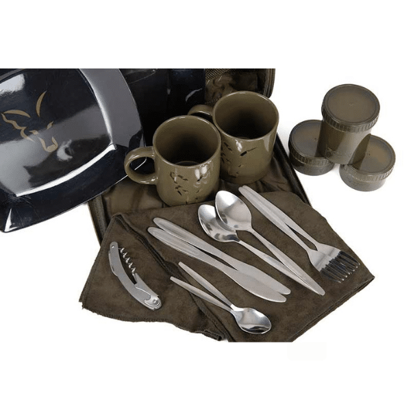 El Fox Camolite 2 Person Dinner Set es un set de cena completo y práctico, diseñado para disfrutar de las comidas en la orilla con comodidad, orden y estilo. Fabricado por Fox, es ideal para sesiones de pesca de dos personas.