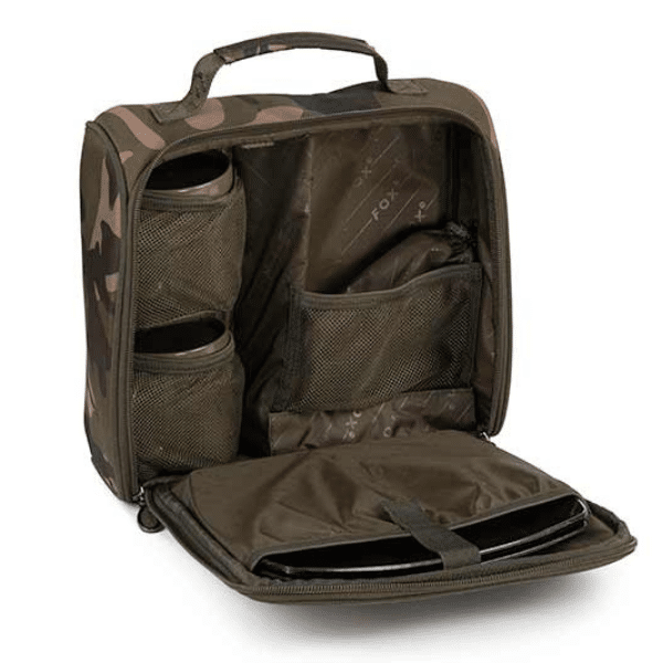 Todo el contenido se guarda de forma ordenada en una bolsa acolchada, con asas de poliéster acolchadas para un transporte cómodo. Está fabricada en poliéster tratado 500D, resistente y repelente al agua, y luce el exclusivo patrón Fox Camo, combinando funcionalidad y estética.
