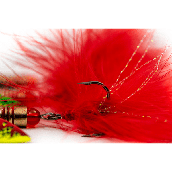 El punto de ataque está reforzado con fibras rojas que estimulan la agresividad del depredador, mientras que su anzuelo triple VMC 2/0 asegura una clavada firme y segura.