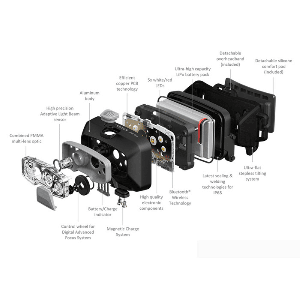 El Ledlenser HF8R Core es una potencia adaptativa a tener en cuenta. Lo más destacado: nuestra tecnología de haz de luz adaptativo permite la atenuación y el enfoque automáticos. Por lo tanto, el HF8R es nuestro primer faro que se puede utilizar con manos libres y no requiere ningún control manual. Además de eso, viene con tres niveles de brillo y una luz frontal roja. Gracias a nuestro sistema de enfoque digital avanzado pendiente de patente, el HF8R Core permite un enfoque prácticamente perfecto. Además, se puede controlar de forma remota a través de la aplicación Ledlenser Connect (actualización paga con funciones adicionales disponibles), mientras que la diadema ofrece una gran comodidad y un ajuste perfecto. Puede cargar fácilmente la batería integrada mediante el sistema de carga magnética. Otra característica útil es el indicador de estado de la batería.