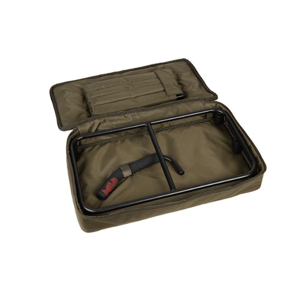 Incluye un reposa caña acolchado integrado, ideal para mantener la caña segura y al alcance durante las sesiones de cebado. Compatible con cubos cuadrados de 10 y 17 litros, este soporte se entrega con una bolsa de transporte verde, perfecta para protegerlo y transportarlo fácilmente.